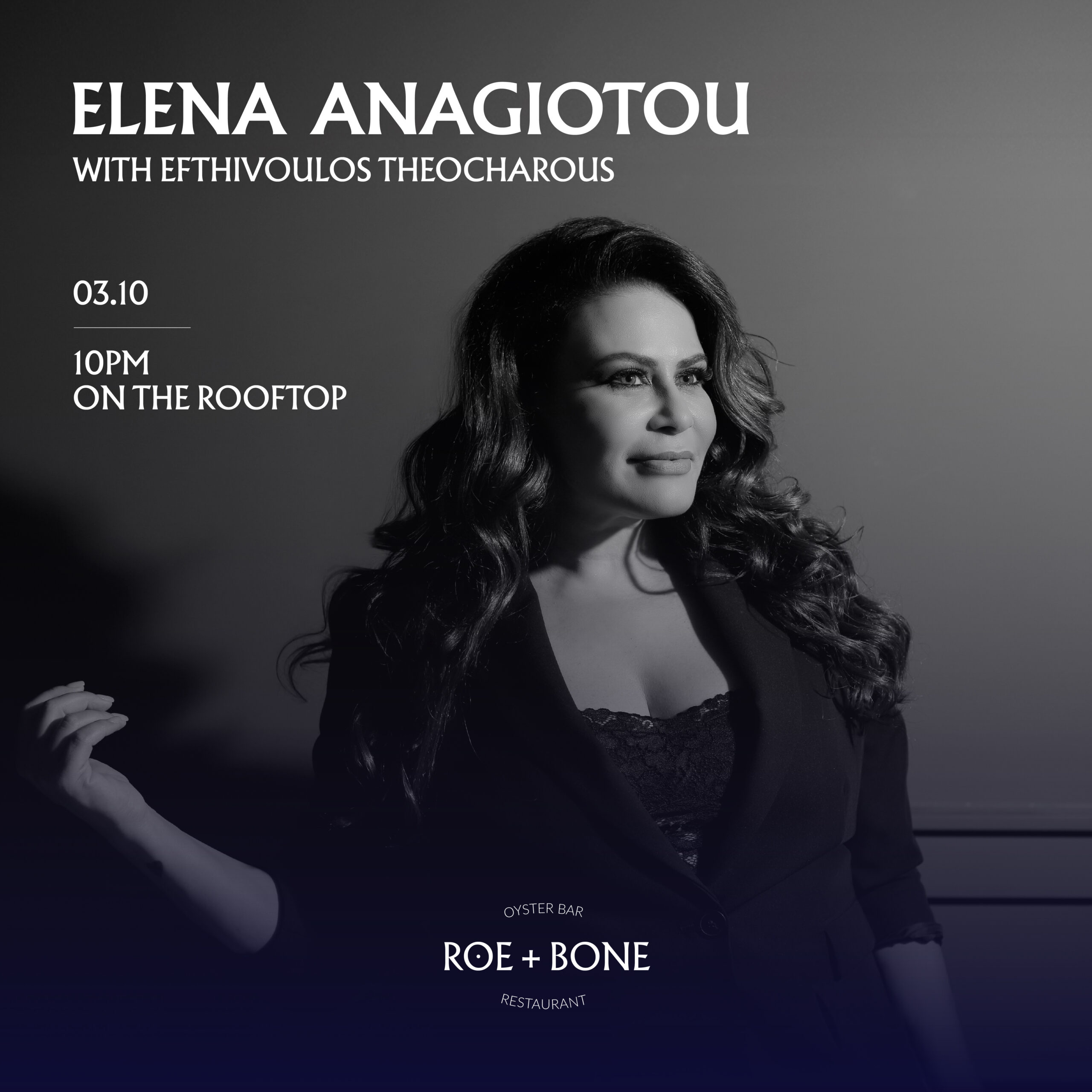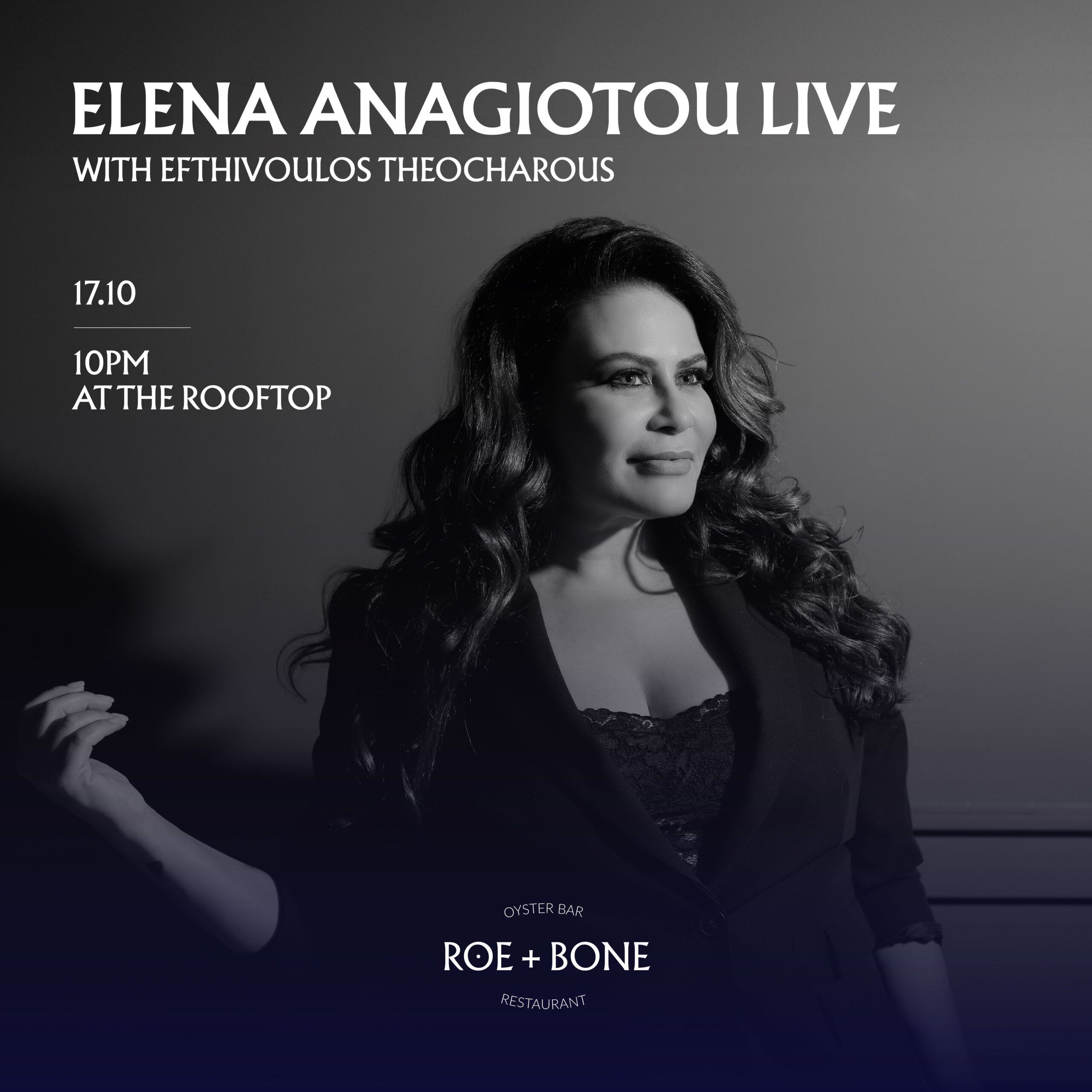 Elena Anayiotou live, every Friday night alongside Efthivoulos Theocharous, on the rooftop of ROE + BONE. Catch them this Friday, October 17th at 10PM. 🎤💫